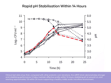 In controlled testing, LB931® stabilised pH levels within 14 hours and supported an optimal mildly acidic range within 24 hours. Maintaining this natural acidity helps discourage harmful bacteria and promote balanced microflora.